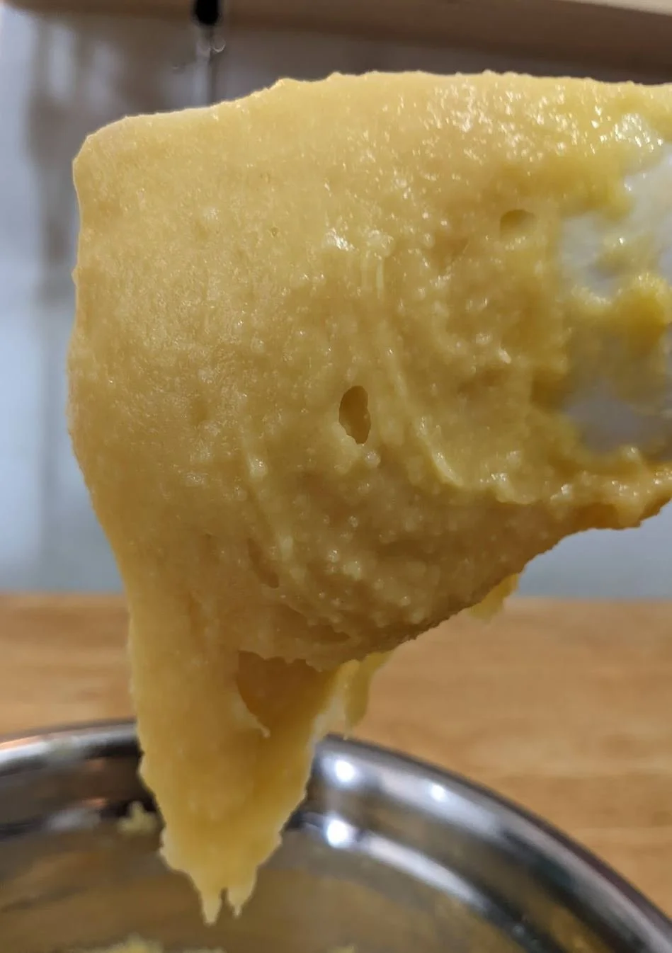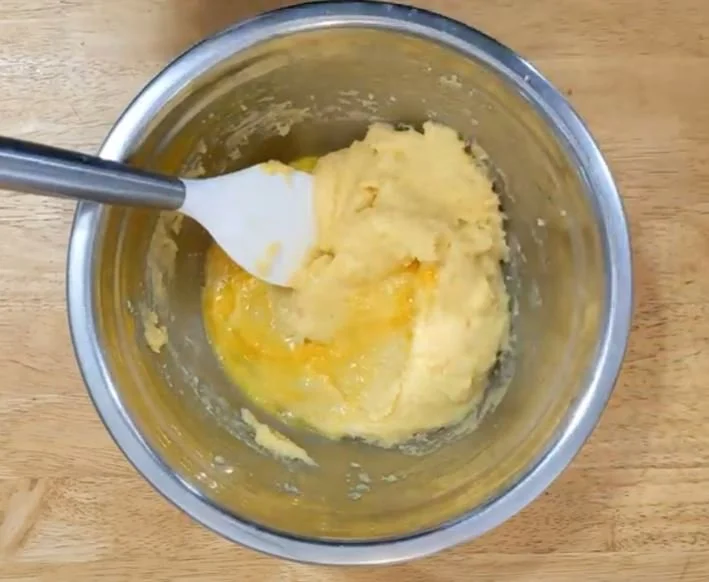 6. Start re-hydrating the dough with the eggs. Add the eggs one by one, mixing well with the spatula between each egg. Re-do until you get the right texture, as shown below.