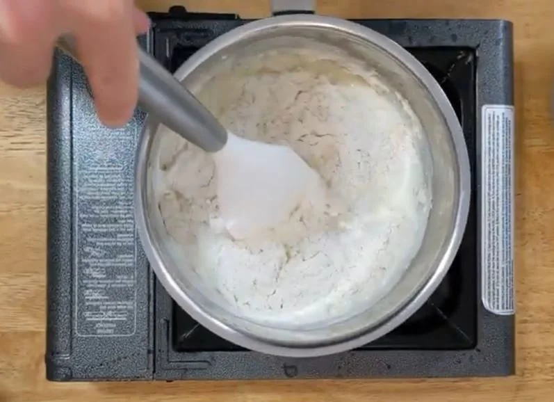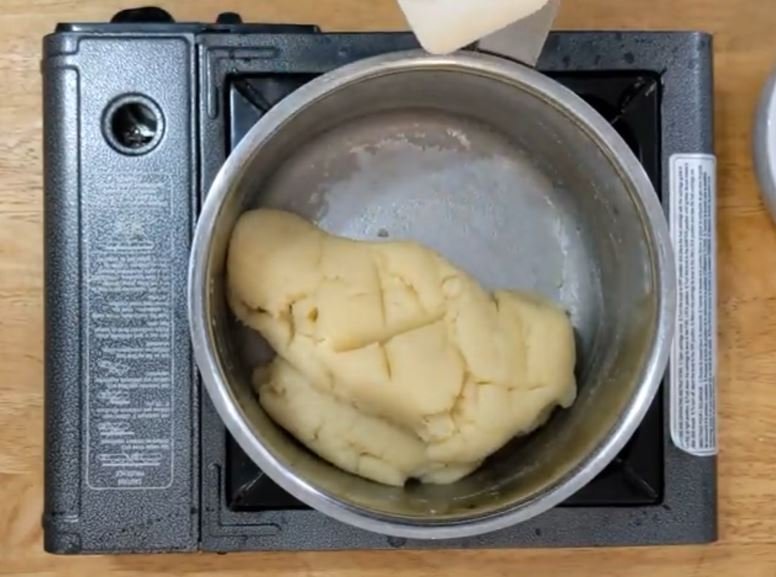4. Put the sauce pot back onto the stove on medium heat and start drying the dough. To do so, keep stirring the dough with your spatula so it doesn’t stick to the pot and let the water evaporate until you get the desired texture: a dough that will form a ball easily, without sticking to the sides of the pot. To double check, stick the handle of your spatula in the dough. The print left by the handle should not disappear.