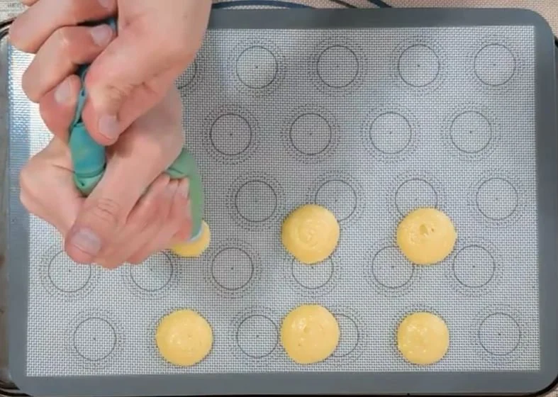 7. Transfer the dough in your piping back and pipe your choux on a baking tray covered with parchment paper or a baking mat. You can pick the size you want your choux to be. I like to pipe then in a circle of roughly 4 cm of diameter.