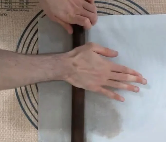 6. Cover the sheet with a second one, then, using a rolling pin, spread your dough evenly until it reaches a thickness of roughly 3mm. Then, transfer it to the fridge for at least 30 minutes.